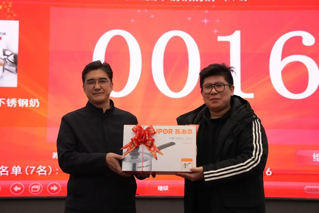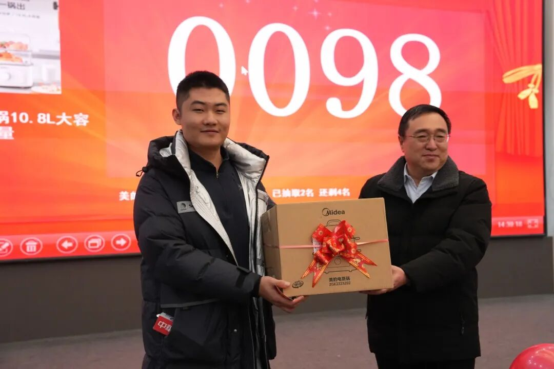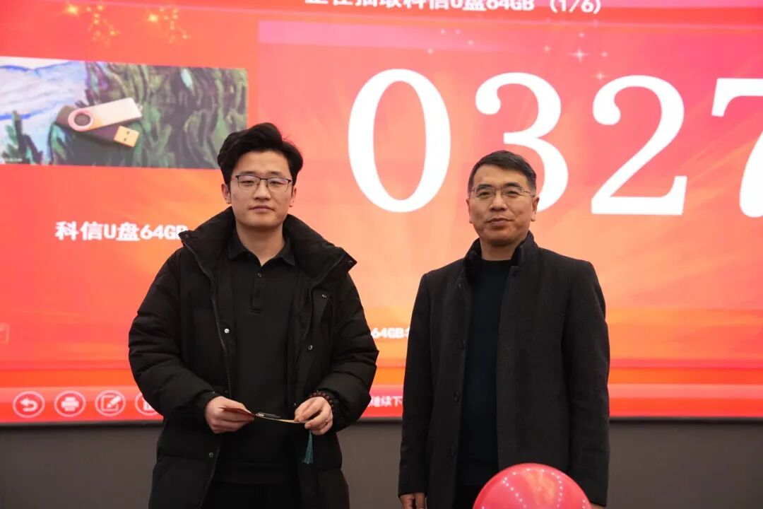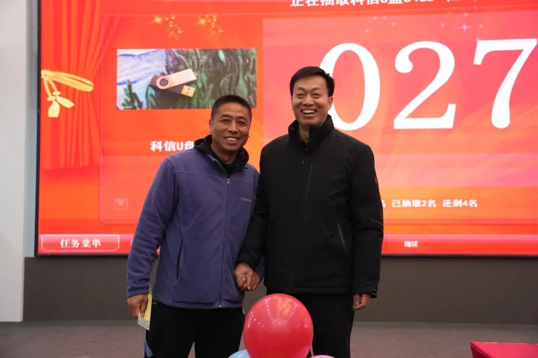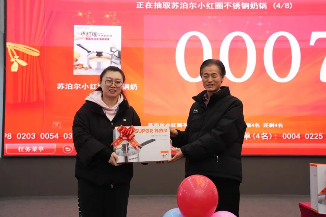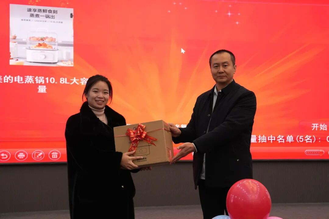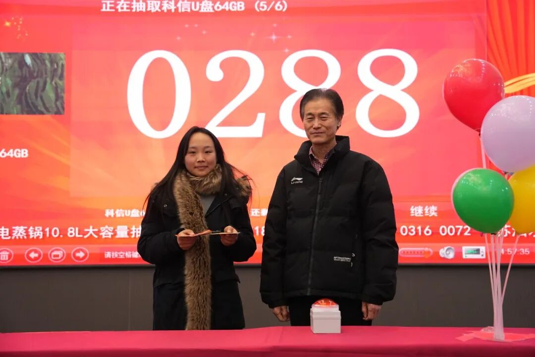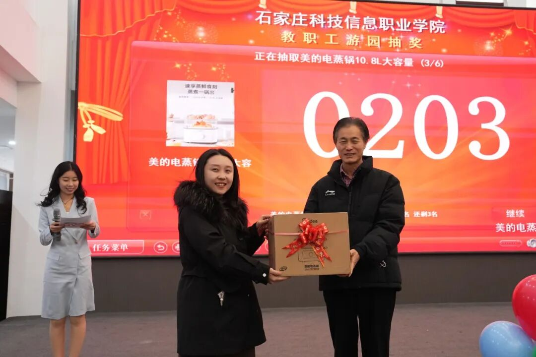 第一环节“幸运大放送”,由校领导通过大屏幕现场抽奖,每位校领导随机抽取一名幸运教职工,现场发放幸运礼品。全场教职工热情高涨,一同见证幸运者的诞生。